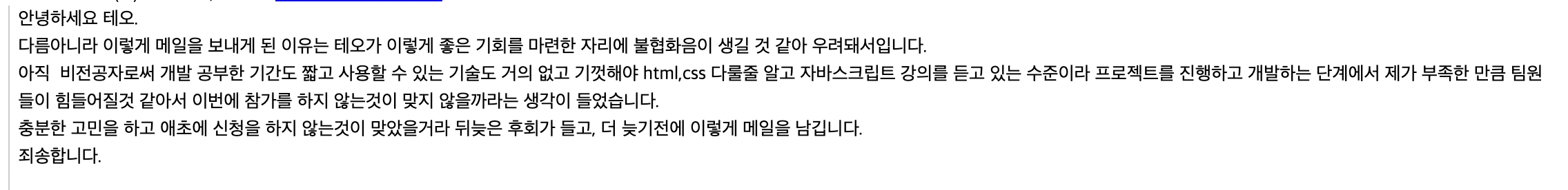 - 기술의 부족 : 다른 사람들은 최소 6개월 이상 공부했고 팀 프로젝트를 한번 이상 개인 프로젝트는 3번 이상 만들어보신 분들임에 비해 나는 정말 보잘것없는 기술과 프로젝트의 경험이 전무후무 했었기 때문에 정말 부족했다.